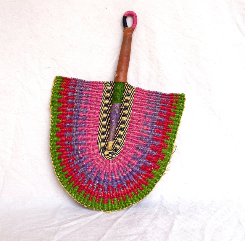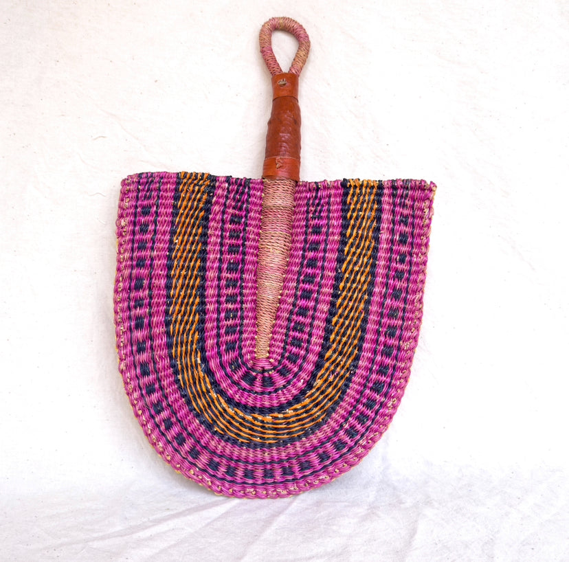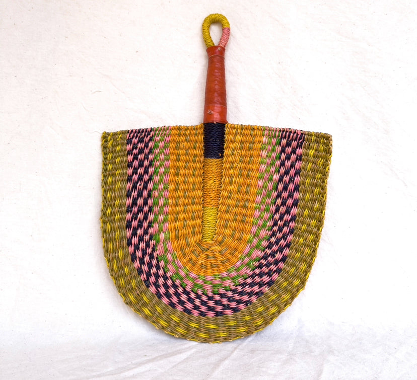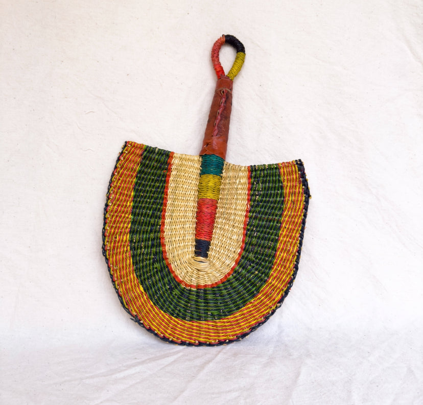 This is a handwoven fan made from elephant grass fibers by local artisans in Ghana.